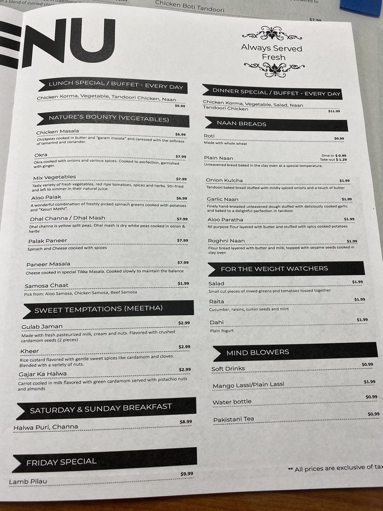 SodaMix VeggiePita BreadGulab JamanVeggie SamosaChicken KarhaiChicken Dam BiriTandoori Chicken